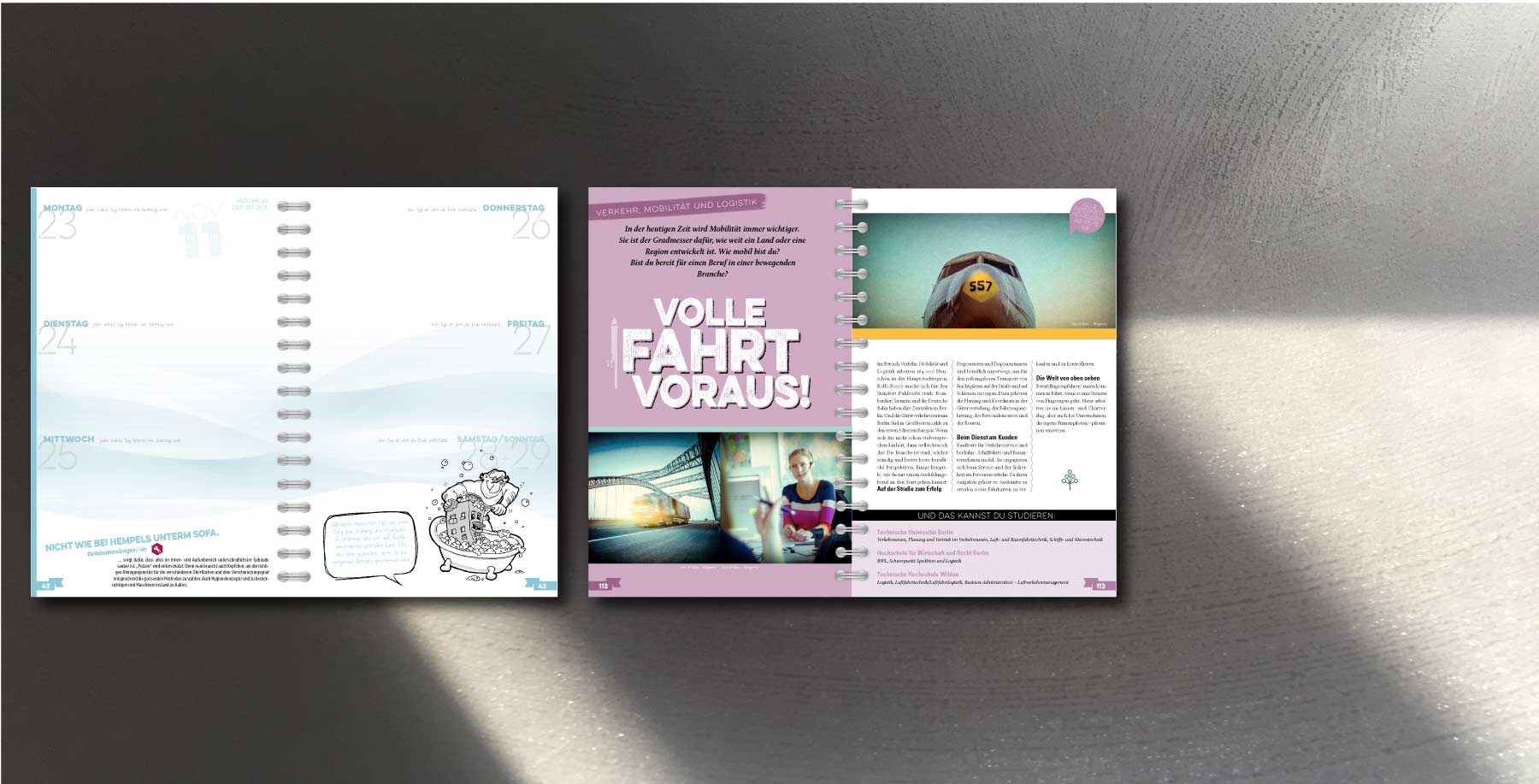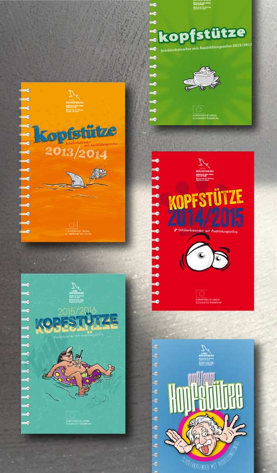 2010 wurde die Aufgabe gestellt, einen Schülerkalender zu realisieren, der den Schülern das Thema Berufswahl näher bringt. Statt Fotos haben wir das Thema mit Comics und eigenen Geschichen realisiert: Die Kopfstütze war geboren.