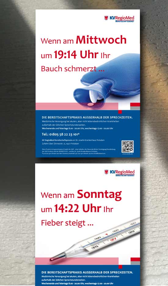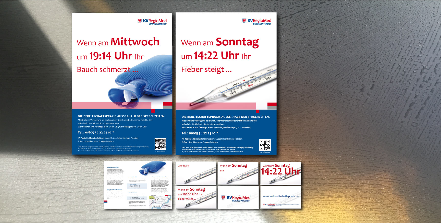 Für die Kassenärztliche Vereinigung Brandenburg wurde eine Kampagne entwickelt, die hausärztliche Leistungen außerhalb normaler Öffnungszeiten etabliert mit Plakaten, Flyern, Tram-Werbung, Shirts ...