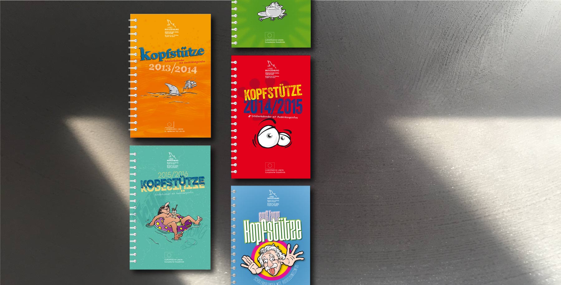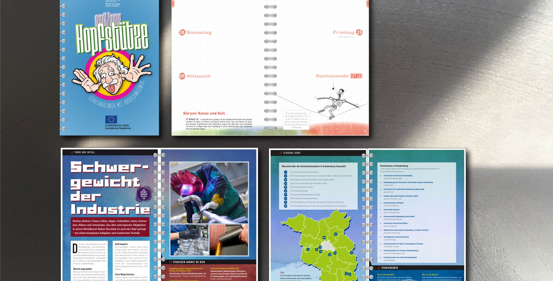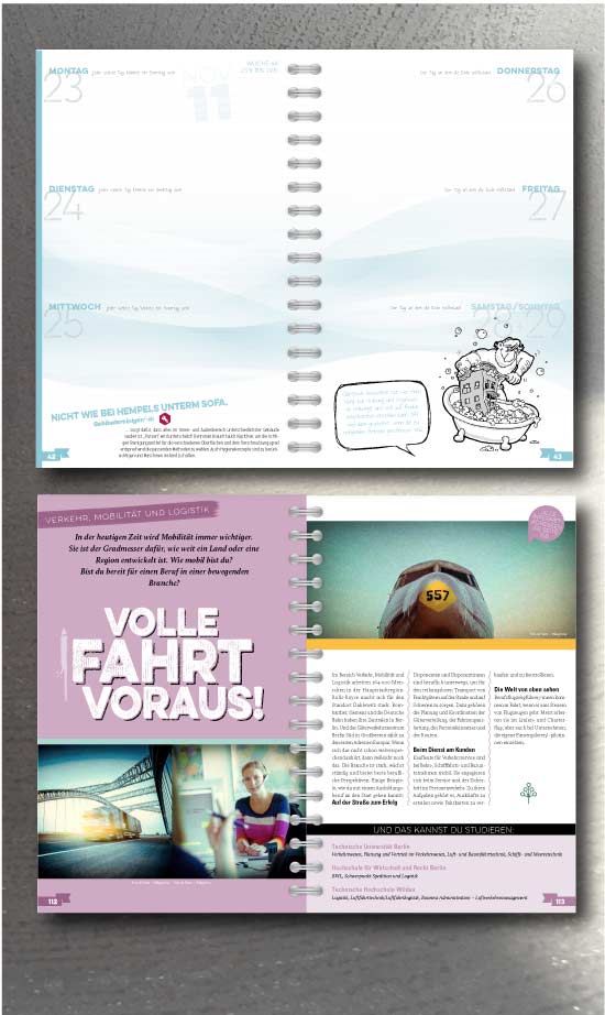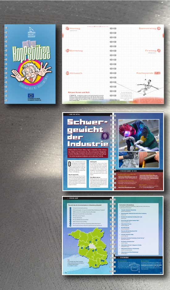 2010 wurde die Aufgabe gestellt, einen Schülerkalender zu realisieren, der den Schülern das Thema Berufswahl näher bringt. Statt Fotos haben wir das Thema mit Comics und eigenen Geschichen realisiert: Die Kopfstütze war geboren.