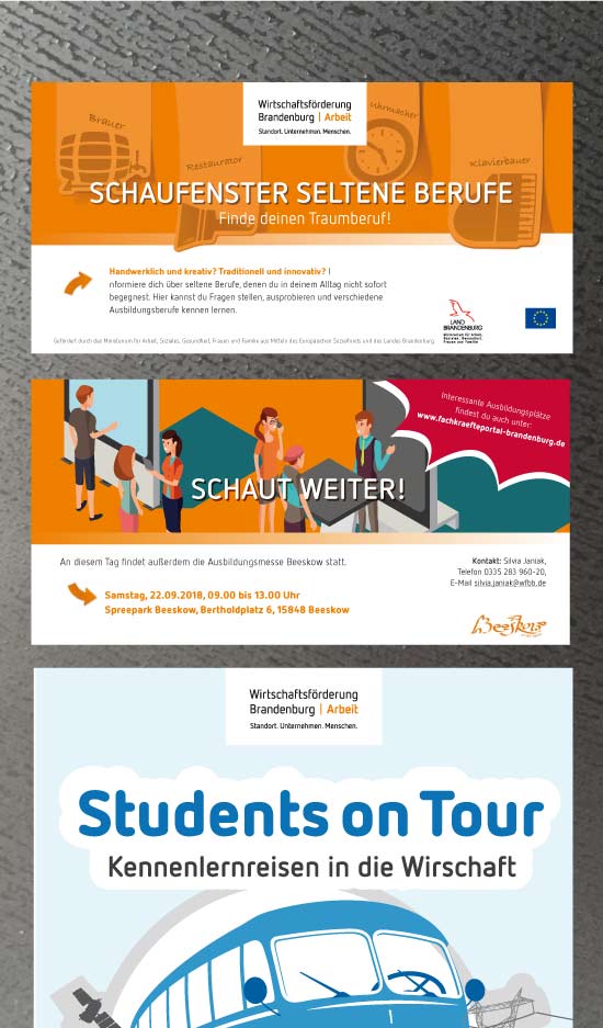 Für die WFBB (Bereich WFBB Arbeit) sind Printprodukte für unterschiedlichste Anwendungen erstellt worden.